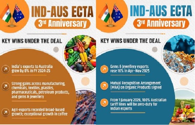 কেন্দ্রীয় বাণিজ্য ও শিল্পমন্ত্রী পীযূষ গোয়েল সোমবার ‘এক্স’-এ এক পোস্টে লেখেন, “গত তিন বছরে এই চুক্তির ফলে ধারাবাহিকভাবে রপ্তানি বৃদ্ধি, উন্নত বাজারে প্রবেশাধিকার এবং শক্তিশালী সরবরাহ-শৃঙ্খল স্থিতিস্থাপকতা অর্জিত হয়েছে। এর মাধ্যমে ভারতীয় রপ্তানিকারক, এমএসএমই, কৃষক ও শ্রমিক—সকলেই উপকৃত হয়েছেন।”