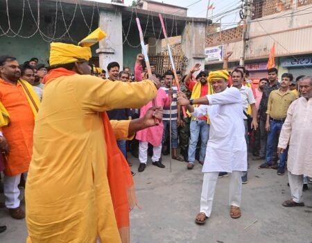 रांची। रांची में शनिवार की रात महाअष्टमी के अवसर पर भव्य झांकियां निकाली गईं। रात 10 बजे से देर रात लगभग तीन बजे तक अपर बाजार और मेन रोड में महाबली हनुमान और भगवान श्रीराम के जयकारे से गूंजते रहे। झांकियों में शामिल सैकड़ों श्रद्धालुओं ने अस्त्र-शस्त्र का प्रदर्शन किया।