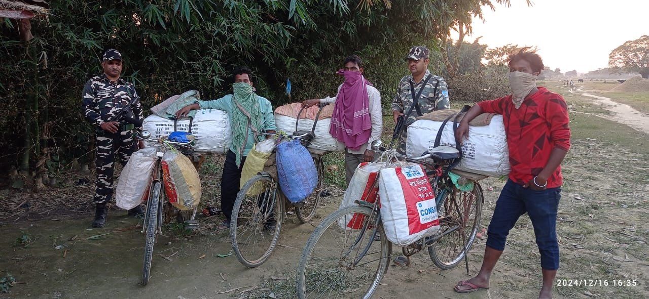 एसएसबी जवानों में तीन साइकिल भी मौके से बरामद किया। एसएसबी 56वीं बटालियन के तेलियारी बीओपी के जवानों ने यह कार्रवाई मंगलवार को मधुबनी गांव के बॉर्डर पीलर संख्या 182/13 के पास भारतीय परिक्षेत्र के सीमा से सटे इलाके में गुप्त सूचना पर की। तेलियारी बीओपी के एएसआई कुलदीप सिंह के नेतृत्व में एसएसबी की टीम ने यह कार्रवाई की।