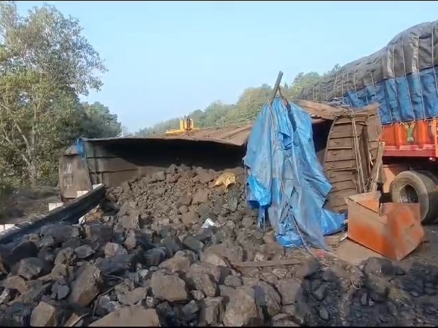 दनुआ घाटी में पलटा कोयला लोडेड ट्रक, लगी 10 किमी तक लंबी जाम